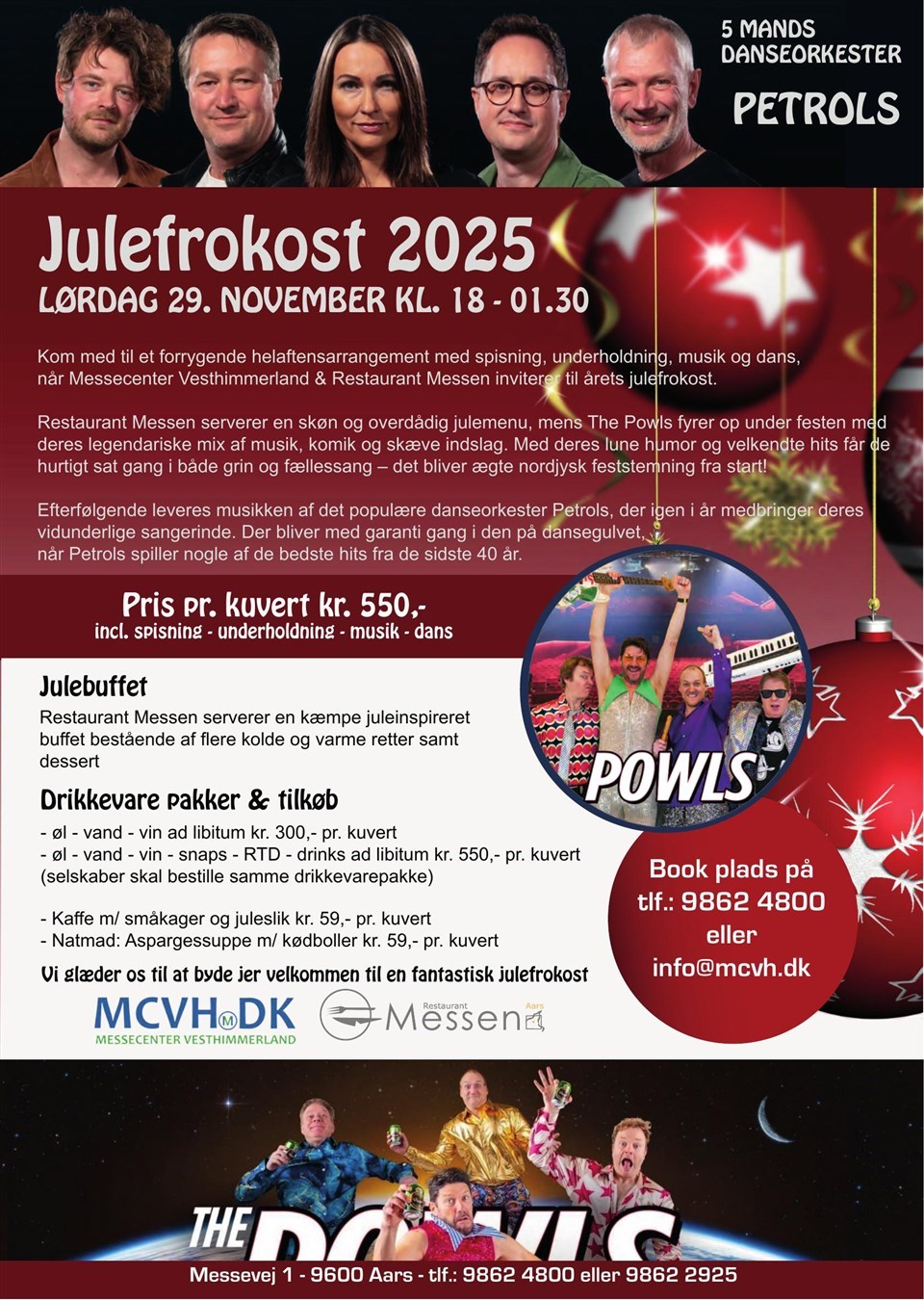 Lørdag den 29. november 2025 inviterer Messecenter Vesthimmerland og Restaurant Messen til en uforglemmelig julefrokost for virksomheder, kollegaer og venner – med et storslået program fra kl. 18.00 til 01.30.