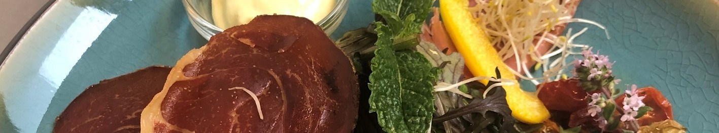 - Carpaccio af røget okseinderlår med urtemayonnaise, ost, svampe og urter